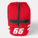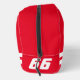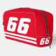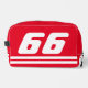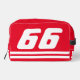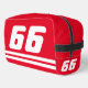 Custom red auto racing sports travel toiletry bag kit. Personalised Dopp kit with custom name and number. Cool Father's Day or Birthday gift idea for men.