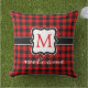 Fun outdoor throw pillow with contemporary black and red chequered plaid pattern. Stylish rustic unique design with room to customise or personalise with your family name monogram. Original personalised monogrammed outdoor decor accent for decorating the front porch rocking chair or yard of your country cottage house, rustic log cabin, mountain lodge, fishing camp, lake or river vacation home.
