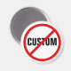 Custom red forbidden sign round magnets. Make your own prohibited icon kitchen magnet with anti text or image in the background. Round circle transparent overlay with diagonal cross vector design. Create a personalised stop warning or opposition protest against something. No smoking, no photos, no dogs etc.