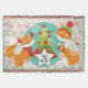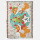 Customised Red Fox Christmas holiday throw blanket, colourful, fun, cute, and cheery! Features two red foxes with winter hat and scarves, a Christmas tree with red balls, and snowflakes of white on a background of aqua blue with a border of white with various coloured snowflakes. There's also a star shape banner you can personalise with your monogram initial!