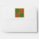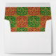 Custom A7 return address envelopes with a red and green Christmas art pattern with a vintage gothic, fleur-de-lis pattern restored from antique tiles.