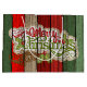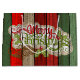 Beautiful, unique, classic, trendy, pretty and decorative Christmas holiday greeting label with a classic Holiday dark red, forest green, and white coloured 'Merry Christmas' quote text on a rustic weathered wooden country cottage farmhouse style planks pattern background.