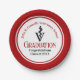 This modern custom red veterinary medicine school graduation party paper plate features the college graduate name in elegant black script for the class of 2025. Customise with your university under the veterinarian medical caduceus for great commemorative graduation decor for a DVM.