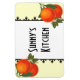 A kitchen fridge magnet with deco letters and vintage art of oranges and orange flowers on a creamy background.
