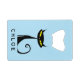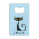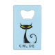 This personalised credit card bottle opener design features a retro mid century modern "atomic" black cat with big yellow eyes and a curly tail.