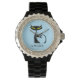 This personalised rhinestone black enamel watch design features a retro mid century modern "atomic" black cat with big yellow eyes and a curly tail.