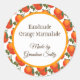 A custom sticker with vintage kitchen crate art of oranges with small blossoms on the background with brown retro and script letters for your handmade recipe name and yours, or customise It to add or subtract text, change lettering style, background colours, even save your custom canning label for later!