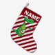 Christmas stocking with red and white candy cane stripes with a green dinosaur cartoon playing an electric guitar. Personalise with your child's name.