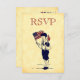 Custom RSVP cards with letters in brown and vintage Americana 4th of July art with a patriotic boy holding red holiday fireworks and an old US flag on a faux parchment background. This template has vintage letters for RSVP information, return and planner address and response date.