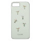 This custom phone case is featuring a charm of ruby-throated hummingbirds, male and female, on a pale green background. The font, font size and color can be easily changed by clicking on "customize further".