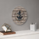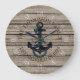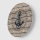 Vintage blue anchor with teal green coloured rope on antique weathered wooden planks pattern motif. With room to customise with family name and established date of your choice. Ideal for a rustic wood log cabin look in your bedroom, hallway, living or family room, kitchen, man cave, or mountain lodge.