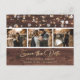 Personalised rustic wedding photo save the date postcards featuring a photo collage of 3 images against a rustic wood background adorned with string lights. Easily personalise this rustic photo save the date postcard with your images and wedding details including a wedding website, if desired. For custom requests, please send us a message.