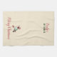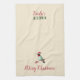 Cute custom kitchen towel featuring a ruby-throated hummingbird wearing a Santa hat. The font style, font size and colour can be changed by clicking on "customise further."