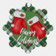 Unique, classic, cute, and decorative Christmas holiday ornament card with Santa's red mittens on a classic red, green, white and blue tartan pattern background and classic Happy Holidays quote text. With room to customise or personalise with family name, greeting, or wish of your choice.