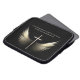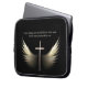 Christian religious cross with the wings of the Holy Spirit and personalised Scripture verse in gold and white on black. Leave the Bible verse as is or type in your favourite religious passage. Laptop sleeve computer cover reads "O give thanks unto the LORD; for He is good. For His mercy endureth for ever." You may change this verse if you prefer.