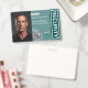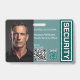 Custom teal photo ID badge template designed for security officers, event staff, and company employees. Features space for photo, name, ID number, expiration date, QR code, and company logo. Bold teal background with modern security panel for a professional and trustworthy look.