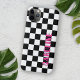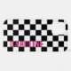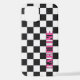 Fun funky black and white, and hot pink coloured racing flags check pattern design. With room to personalise or customise with a name of your choice in bright white and black colours. Funky, elegant, stylish, and eclectic design for the fancy artistic fashionista, the artsy fashion diva, popular hip trendsetter, vintage retro art style, and abstract digital geometric motif lover who wants to protect their phone from dust and dirt, wear and tear. This design is available for Apple iPhone 6, 7, and 8 Plus, 10 or X, XR, XS, 11, 12, 13 Mini, 14, 15 Plus and Pro Max cellphone cases. Show off your style, look fashionable, and feel stylish with a unique design on a mobile device accessory of your choice.