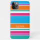 Contemporary bright mint green, azure sky blue, sunny summer orange, hot pink, and white coloured stripes pattern cell phone case. With room to customise with a name, monogram, or initials of your choice. Beautiful, modern, and cool cover for the trend-savvy and art-loving hip trendsetter, artsy motif lover who wants to protect their phone from dust and dirt, wear and tear. This design is available in Apple iPhone 6, 7 and 8 Plus, 10 or X, XR, XS, 11, 12, 13 Mini, 14, 15 Plus, and Pro Max cellphone cases. Show off your style, look fashionable trendy, and feel stylish with a unique design on a mobile device accessory of your choice.