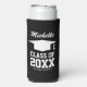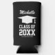Graduate party can coolers with graduation hat / cap. Custom class of 2025 etc. Personalised text and background colours. Create your own party favour. Personalised gift idea for high school graduate students, college, nursing school, university etc. Script typography for name or monogram. Keeps drinks cool. Beverage holder with double sided print. Customisable background colour. Also great for school reunion parties.