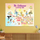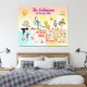 Bright and colourful scene offers a spectacular view of Southern California - wacky characters frolic on the beach and desert of SoCal showcasing Los Angeles, Orange County, San Diego, Santa Barbara, Riverside, Palm Springs, El Centro, Anza Borrego and Joshua Tree parks as well as the border cities of Tijuana, Tecate and Mexicali. This charming scene has it all – a surfer hangs ten while a killer whale leaps out of the water, zoo animals greet the tourists, wine lovers make a toast as a T-Rex roars a challenge and a hiker is noticed by a UFO and much more…