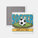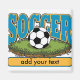 A Soccer sits ready on the grass with large blue SOCCER text outlined in yellow! Add your custom text below this Soccer design in the space provided. Perfect for any Soccer player or Soccer fan, add names, school names or sports message! Customisable Soccer shirts and Soccer gifts!
