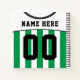 This design is a soccer / football style jersey with green vertical stripes and black trim, the background colour can be changed, just click on CUSTOMIZE.