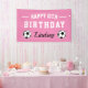 Custom soccer theme Happy Birthday party banner. Soccer ball design with fun typography and custom pink background colour.