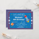 This fun birthday party invitation features a rocket ship blasting off and a polka dot planet on a blue outer space background with stars. Completely customisable.