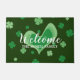 Custom St Patricks Day door mat with lucky clovers. Make your own personalised indoor or outdoor doormat sign with custom background colour and text. Add your own welcome message, business name, surname, initial letters or funny quote. Fun gift idea for new home, party location, new office, relocation, store, shop, professional company office, business etc. Personalizable template with elegant typography. Create your own classy entry mat / rug for front door / entryway or hall. Customisable home decor / decorations for Irish family. Green design with shamrocks and hearts.