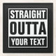 Custom STRAIGHT OUTTA glass coasters. Make your own custom STRAIGHT OUTTA home accessories. Funny typography design with big letters. Add your own city, parody or quote to this template / meme generator. Cute black and white internet meme gift idea for men and women. Cool personalised examples: Straight outta bed. Straight outta money. Straight outta ideas. Straight outta coffee. Straight outta prison. Straight outta the gym. City names; compton chicago new york LA boston brooklyn. Fun decor for home and office.