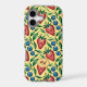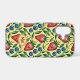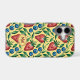 Joyful iPhone Case with fruity summer vibe - Watercolor Strawberry and Blueberry Pattern on a yellow Background - is an ai generated design and shows a seamless repeating fruity pattern with red Strawberries, blue Blueberries and green Leaves.