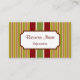 Modern maroon, beige and green stripes decorate this professional business card. Customise the information on this business card to suit your needs, add or delete information, change the font style, font size, etc...The design is from original art. Use this stylish business card for a spa, salon, small business, home decor, interior design, bed and breakfast, inn, antiques, coffee shop, event planner, bed and breakfast, sales, marketing, real estate, auto, cars, auction, dentist, attorney, etc...