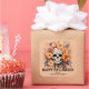 This customisable Halloween sticker features an ornate sugar skull surrounded by lush orange and golden flowers, blending Día de los Muertos inspiration with gothic romance style. The warm autumn palette and detailed florals make it a standout choice for party favours, treat bags, or seasonal gifts. Personalise with your family name or message.