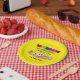 Bright yellow Teacher's Welcome to My Class paper plates, showing a bright colourful WELCOME followed by wording which reads (insert your name here)'S CLASS IS A HAPPY PLACE. This text is CUSTOMIZABLE so you can add your name and class or create your own text. There is also a group of smiling face icons. You can use these Welcome party plates to welcome your new students back to school with a special welcome party. Matching party supplies and gifts are available. Other colours available.