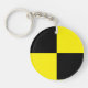 Crash test dummy keychain. Custom black and yellow chequered key chain. Customisable colour. Round car crash accident sign key chain. Add your own text optionally. Automotive industry gifts.