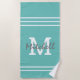 Editable beach towel featuring a trendy teal background that can be changed to any colour, sporty white stripes, initial, and name. Easily personalised so you look great on your sun lounger around the pool or at the beach!