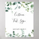 This custom text calligraphy script green foliage sign is perfect for an elegant wedding or bridal shower. The design features watercolor hand-drawn elegant botanical eucalyptus branches and leaves, arranged in beautiful bouquets and geometric patterns.