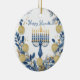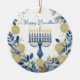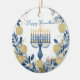 This exquisite Hanukkah ceramic circle ornament, named “Festival of Lights Harmony,” is a perfect addition to your holiday decor. It features a beautifully crafted Star of David in a stained glass style with rich hues of blue, gold, and brown, creating an elegant mosaic effect. In the centre, bold white letters spell out “Happy Hanukkah!” . This message adds a personal touch that resonates with the joyous celebration. Customisable text options on both sides allow you to add a personal greeting or name, making it an ideal keepsake or gift.