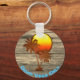 This summery keychain features a laid back message, the customisable text says Good Vibes Only in light blue print. The design features a orange sunset and brown palm tree silhouettes on a faux wood texture background that brings to mind an old wooden pier at the beach. This key chain is fully customisable. You can edit the text, font, font colour, and shape. Just hit the Personalise button to edit the text, or the Customise button to make any font or colour changes, and make it your own. Makes a great gift, party item, or summer momento! Great for lovers of the beach, ocean, summer, retro designs, and mellow, good vibes. This design is also available on stickers and other items.