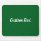 This forest green mouse pad has text in white script. The text can be edited to show a custom message or deleted