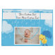 The background is of a pretty, bright blue sky with puffy white grey clouds and raindrops coming down. Next to your photos, will be the sweetest baby chick. He is bright yellow holding onto a dark blue umbrella with poke a dots and blue rain boots on his feet. This design can be for boy or girl.