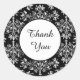 A custom Thank You round sticker with vintage floral art in white on a black background. Customise it to change fonts, background colours, upload an image and more, even save your design for later.