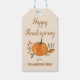 Custom Happy Thanksgiving gift tags featuring a pumpkin and autumn leaves.