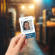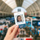 Custom tour guide badge with photo, name, flags for langage, company name for tour operator, travel tourism tours, walking city tour. Add photo name firstname of the tour guide. Personalised modern badge tourist visitors guide. Photo badge customisable that can be worn by someone who gives city tours for tourists or visitors. Identity photo badge for travel industry.