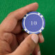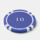 Blue Poker Chips with value 10: easily change the value (from 1 to 5000) and name on the back for your poker nights or home tournaments. These tokens can also be used as drink tickets, golf markers, bachelor parties or as gifts to players!
