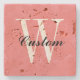 Custom travertine coasters with chic name monogram. Elegant gift idea for friends, family, couple, coworker, boss and others. Classy monogrammed Birthday present for him or her. Stylish script typography. Also great as table decor for fancy wedding party. Pink or custom colour. Thick square coaster available in different materials like sandstone, marble and limestone.