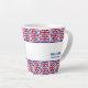 Patriotic UNION JACK Latte Mug, specially designed for hotels, guesthouses, businesses and within the hospitality industry. The design shows plain white panel with the Union Jack in a tiled pattern background. The customisable text reads WELCOME plus placeholder name, which you can personalise with the name of your business, and also add your own greeting. The text is right hand justified and can go full width across. A great way to add those small but vital touches for your clients, visitors and guests. This flag design offers a patriotic twist to your corporate drinkware.
