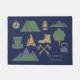 Easily add the name of your favourite campground and the state it's in to create your own souvenir camping doormat or add a family name or other text to create your custom welcome mat for your vacation cabin featuring a collage of camping scenes and outdoor equipment in orange, tan, light blue and green against a navy blue background. Makes a cool gift for campers and anyone who loves the great outdoors. There are illustrations of mountains, a tent, a campfire, a lantern, hiking boots and more.