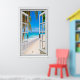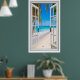 Ocean view fake window. Beach and palm trees scene, for a windowless office wall. Fun, realistic optical illusion scenic poster for an office or study wall.