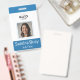 custom blue vertical badge with an employee photo and name. Personalise it with an employee ID number, role, title, location, or other important details. Add your company logo at the top for a professional touch. The back of the badge features a custom text field for return information or other key details. This design makes personalisation easy, ensuring each badge is unique and fits your company's needs perfectly.
